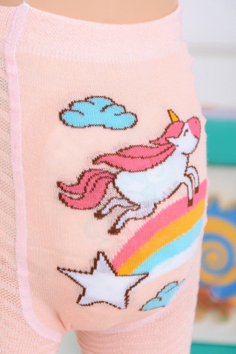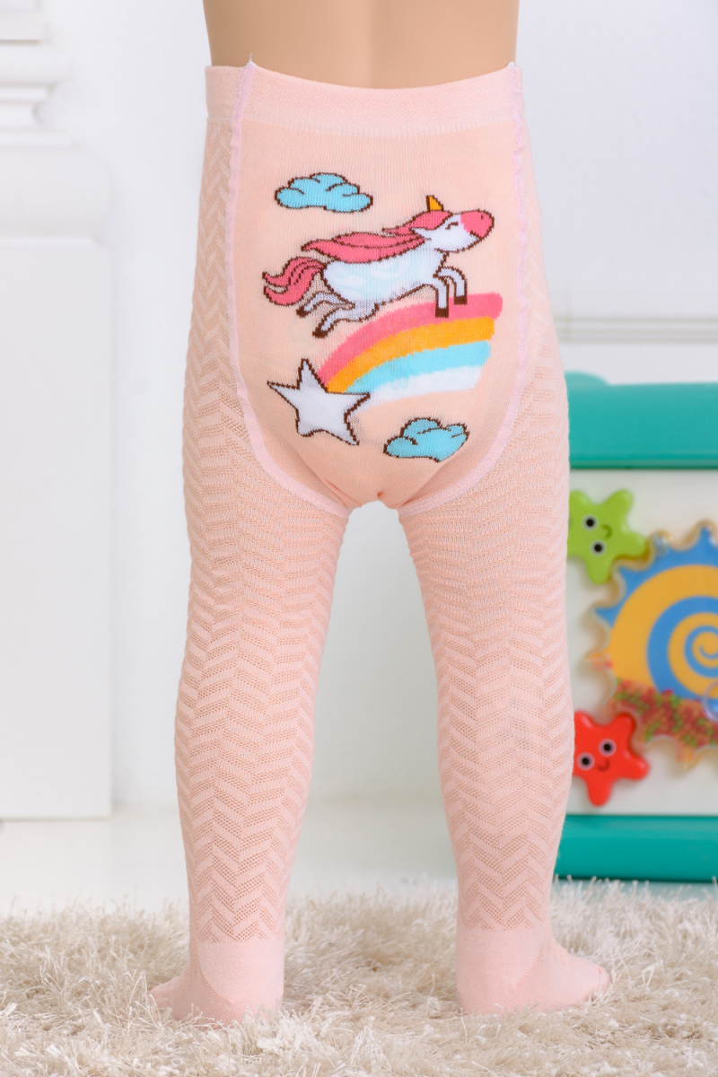 Очаровательные колготки в нежных оттенках. По всем поверхности вывязан узор, сзади - рисунок в виде единорога на радуге