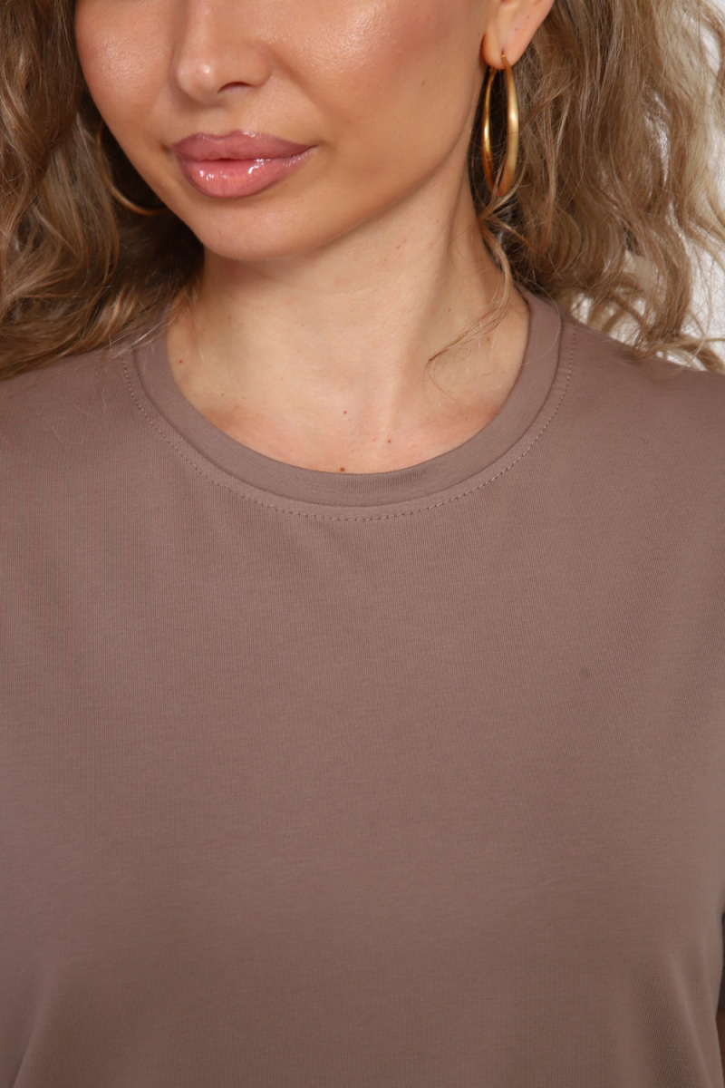 Костюм женский: футболка с короткими рукавами и брюки с боковыми карманами.