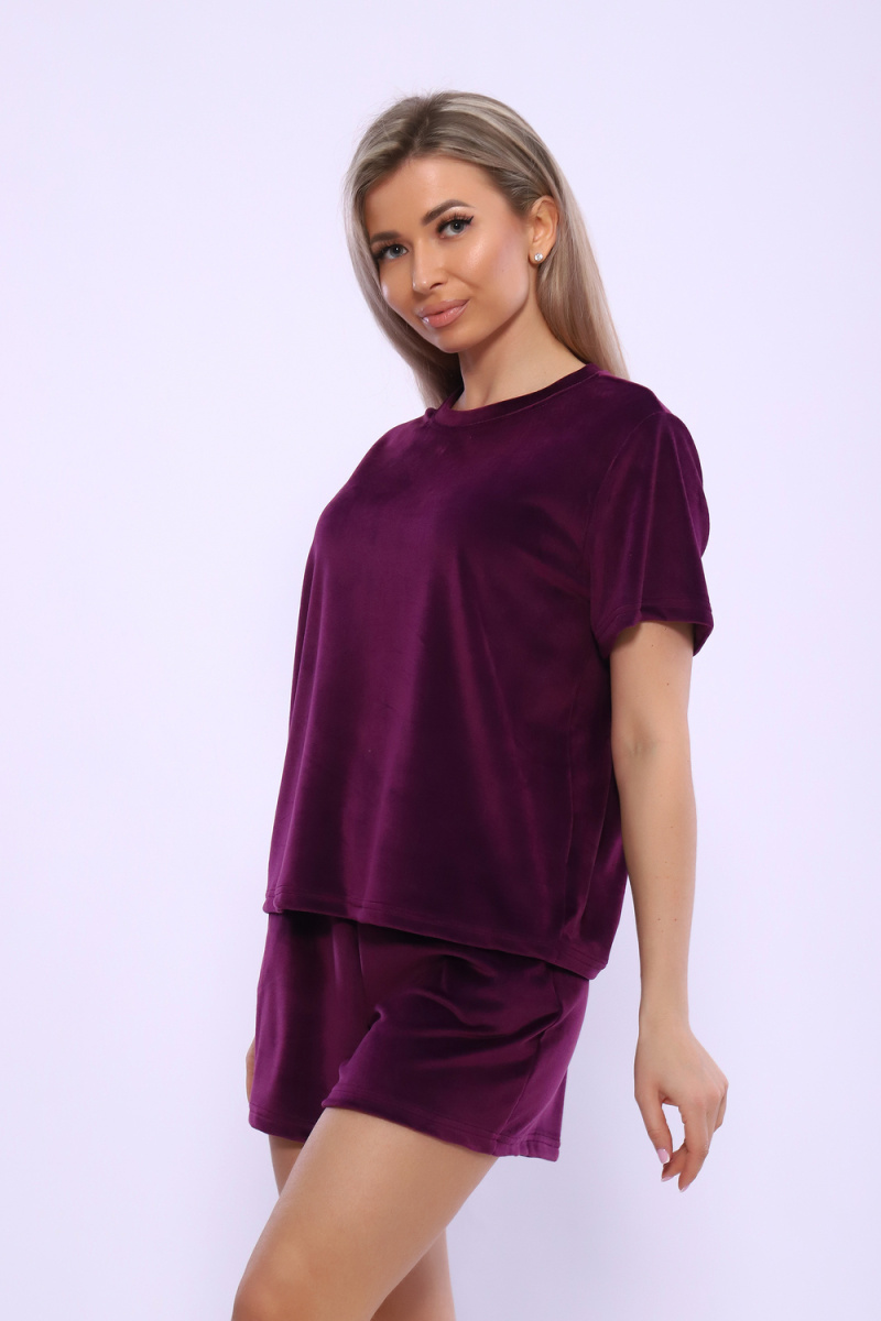 Костюм повседневный с шортами из мягкого велюра. В комплект входят: футболка с коротким рукавом с округлым вырезом горловины и шорты с карманами и поясом на резинке. Удобный велюровый костюм имеет свободный покрой, что делает его универсальной одеждой, которая подойдет на любую фигуру. Он не сковывает движения, скрывает недостатки и подчеркивает достоинства фигуры. Удобные шорты имеют комфортную посадку, резинка не давит, не скручивается, не перетягивает талию. Костюм универсальный, его приятно носить дома и на улице.
